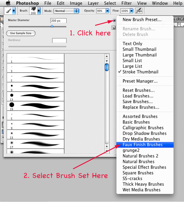 4In the picker, click the triangle on the right side to open the context menu. If you installed the .abr file in the correct folder, Photoshop will display the name of the brush set in the list as shown here: